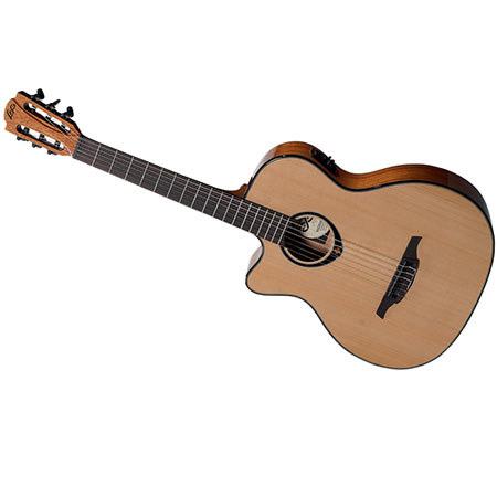 Superior instruments for the starting player, the Lag Tramontane TNL66ACE Left-Handed Auditorium Cutaway Nylon-String Acoustic/Electric Guitar is distinguished by their deep gloss finish and bold black and ivory rosette work. The spruce tops and mahogany back and sides are accented by distinctive black and ivory binding. The necks are finished in French Satin for feel and comfort. It features DIRECTLAG preamp and a saddle-mounted Nanoflex Piezo pickup.
