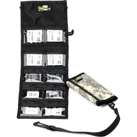The LensCoat CF10 Memory Card Wallet (Digital Camo) holds up to 10 CF cards or 10 QXD cards. The material is a lightweight, waterproof poly tricot/nylon. The wallet secures with a quiet elastic closure and is carried by a clip-on tether. All the interior pockets have clear windows so you can easily see which card you need. In addition, a handy business card slot is provided for that quick networking moment.