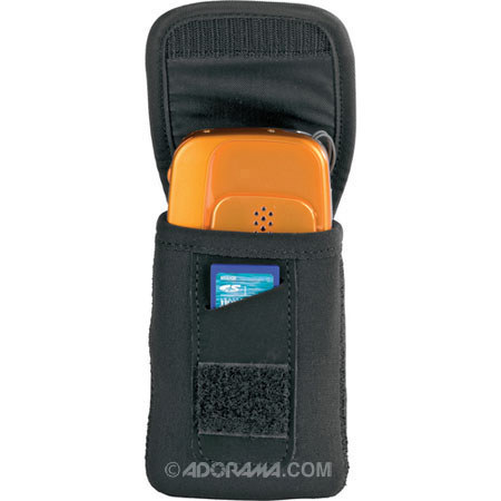 The Lowepro Dublin 10 Camera Pouch (Black) is designed to carry a ultra-compact point & shoot digital camera or small shoot & share video camera with memory card. The pouch is made from neoprene foam that is reinforced with PE (Polyethylene) board to provide cushioned, impact-resistant protection for the camera and camcorder screens. It has a brushed tricot lining that protects the lens and LCD screen from scratches and abrasion and a padded foam flap that offers protection and fast access to the gear. There is a built-in memory card pocket. The pouch can be carried three ways: as a protective pouch to toss in a bag, tote or backpack; around the wrist when a camera strap is threaded through the top opening; or on a belt or strap via the integrated belt loop on the back.