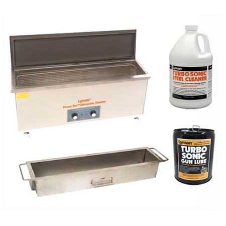 Starter Kit includes Power Professional Ultrasonic Case Cleaner, 5 gallons of Lyman's Turbo Sonic Gun Lube, and 1 gallon of steel cleaner.