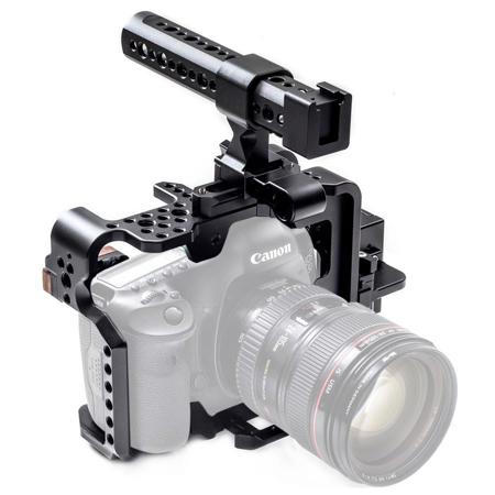 This form-fitting Cage for Canon 7D Mark II is carved out of a single piece of aluminum. The precise ergonomic design allows unlimited usage of mode buttons, memory & battery cartridges without any problems. The hot shoe is open shaped design so you can mount the accessoires directly. A wooden thumb support provides much better grip and handholding. Quick release, Nato rails for top handle and cable clamp makes them easy adjusting and moving. It protects the cable and maximize the convenience of using the cage. The top handle supports a rod clamp for mounting a monitor or other accessories. The body support in the bottom can prevent forward lean when mounting heavy lenses. Numerous 1/4" and 3/8" threads enable you to attach other equipment.