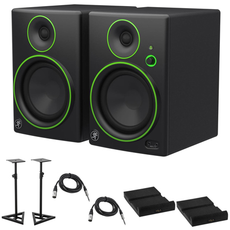 The bundle includes two Mackie CR5-XBT 5" Creative Reference Multimedia Monitors, two Studio Monitor Stands, two TRS 1/4" Male to 1/4" Male Cables, and two Isolation Pads.