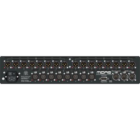 The Midas DL154 Fixed Format I/O Unit 8-Input/16-Output Stagebox delivers legendary Midas sound quality in a cost effective, discrete 2U chassis that utilizes time-tested and proven Midas technologies. Equipped with 8 channels of Midas premium mic-pre amplifiers with 2.5 dB gain steps and 16 balanced line level outputs, selectable sample rate and dual redundant AES50 network ports the DL154 is the ideal partner to the PRO 1 and PRO 2 digital consoles - significantly increasing the network capacity and number of mic. Inputs and analogue outputs.
