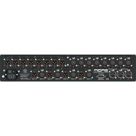 The Midas DL155 Fixed Format I/O Unit 8-Input/8-Output/8-AES/EBU Stagebox delivers legendary Midas sound quality in a cost effective discrete 2U chassis that utilizes time-tested and proven Midas technologies. Equipped with 8 channels of Midas premium mic-pre amplifiers with 2.5dB gain steps, 8 balanced line level outputs, 8 AES3 (AES/EBU) digital inputs and 8 AES3 outputs (with full SRC) the DL155 is the ideal partner to the PRO 1 and PRO 2 digital consoles - significantly increasing the network capacity through additional analogue & digital inputs and outputs.