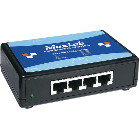 The VGA 1½ 4 Distribution Hub allows one (1) VGA (RGBHV) source to be distributed up to up to four (4 displays via Cat5/6 cable for more cost-efficient cabling. The hub works in conjunction with the Active VGA Balun II Kit (500140) and Active VGA Balun II Receivers (500142). At least one (1) 500140 is required to support one (1) display. Up to three (3) additional 500142 may be added to support up to three (3) additional displays.
