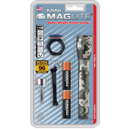 The Maglite Mini AA Flashlight Combo Pack (Camouflage) is a compact flashlight that despite requiring only 2 AA batteries, gives off a powerful beam. The flashlight is water and shock-resistant so you can bring it along worry-free wherever you go. The included lanyard secures the flashlight to your wrist as you hold it, so it's always ready to use. For added convenience, the flashlight comes with a spare lamp those stores below the tailcap spring, so you'll never be left without a light source.