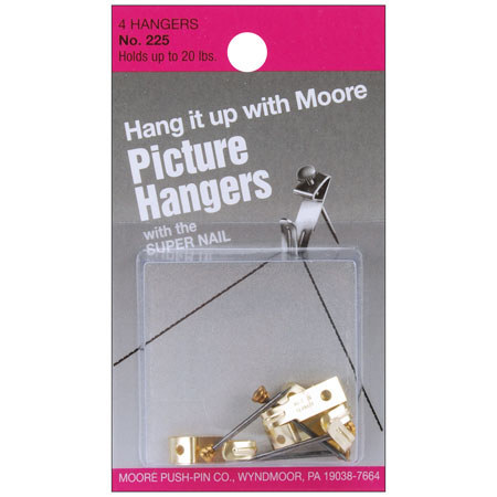 The Moore 20 lbs Hangers (4 Pieces) are all designed to keep your treasured pictures hanging even and securely. Always use correct size and follow directions. It features brass plated steel hooks with blue needle point tempered steel nail. The "Super Nail" easily penetrates plaster or wood and can be re-used.