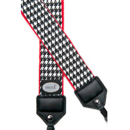The houndstooth camera strap (with quick release) has a classic black and white houndstooth pattern. The minky backing is red.