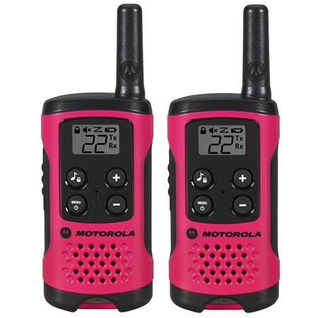 Simple, compact and easy to use by the entire family, the Talkabout T100 Series is the perfect way to stay in touch when out and about, whether at the playground, biking in the park or enjoying a picnic. These colorful radios have a range of up to 16 miles and feature 22 channels, providing you with just what you need to instantly reach your family and friends and know they are safe. T107, which includes two bright pink radios, two belt clips and one user guide.