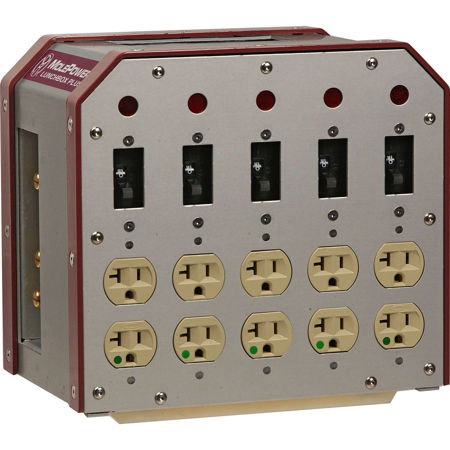 The Mole-Richardson Duplex Distribution Box is also known as a LunchBox. It has a 100 amp Bates (Stage Pin) input with 5 hospital grade, brokered duplex receptacles. It has an aluminum enclosure with reinforced edges and nylon skids. The skids provide isolation from earth-ground and assist in stacking.