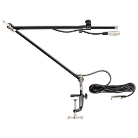 This Pod Stand Broadcast Boom Arm works perfectly with a desktop or any computer working from a desk or table. Every clamp and joint has a lever turn screw for strong or adjustable adjustment. A low noise XLR cable is neatly internalized into the stand's arm and is over 12' long. Your microphone is held securely screwing onto the microphone's base. The position of the microphone can be held upside (for a cello) or right side up for speaking (or flute). The arm holding the microphone has an 8" telescoping tube. If you need more, one can relocate the whole stand. The steel composition exudes solid state durability.