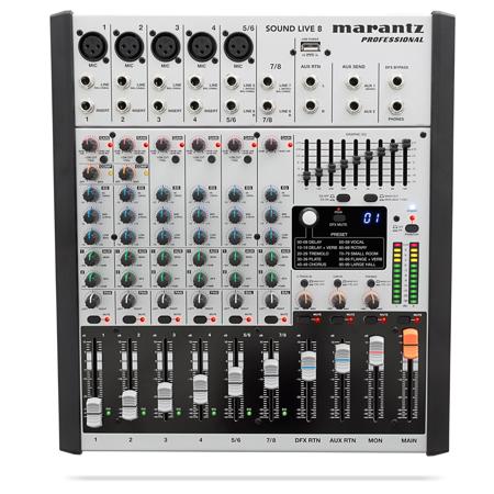 The Sound Live 8 is a compact 8-channel/2-bus tabletop mixer that easily handles all the equipment, switching and signal shaping you need to produce first-rate recordings, without the expense, bulk and inconvenience of an overly-complicated studio console. Among the full roster of professional-caliber features are 5 XLR inputs with ultra-clean sounding Marantz Professional mic pre-amps, Dynamic compression (channels 1 and 2) 60mm faders with mute switch, 100 studio-grade digital effects and a 9-band EQ for main and monitor outputs.