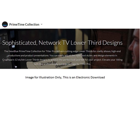 The NewBlue PrimeTime Collection for Titler Pro delivers cutting-edge Lower Thirds for reality shows, high-end productions and product presentations. You can easily adjust the color, text styles and design elements in Graphpax's 12 stylish Lower Thirds designs to achieve the perfect look and feel for your project. Elevate your titling with this professionally-curated package for Titler Pro.