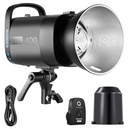 NEEWER S101-400W PRO Studio Monolights, each with 400Ws output and GN65 guide number (1m, ISO100) for commercial, portrait, wedding, and still life photography. 1/100-1/1000s duration time and 0.1-2.4s recycling time are perfect for moving subjects and continuous shooting.
