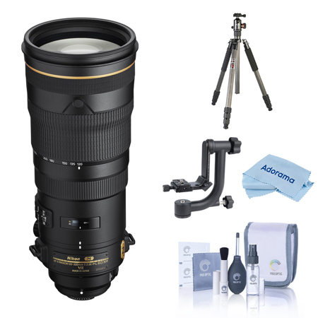 The bundle includes the AF-S NIKKOR 120-300mm f/2.8E FL ED SR VR lens, FotoPro X-Go Max Carbon Fiber Tripod with Built-In Monopod, E-6H Gimbal Head, Cleaning Kit, and Cleaning Cloth.