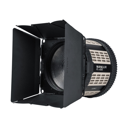 The FL-22E BE Mount Motorized Fresnel Lens is a versatile accessory for Nanlux's Evoke 600C. It offers a variable zoom range of 15 Degree to 50 Degree and features a BE mount with electronic contacts, ensuring full compatibility with BE mount fixtures like the Evoke 600C. The lens can be adjusted using both wired and wireless control options.