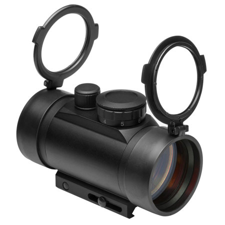 The NcSTAR 1x 42 mm B-Style Red Dot Sight (Ruby Lens) has seven-position rheostat knobs for multiple brightness settings and integrated weaver style mount. It is powered by a 3-volt lithium battery (CR2032).