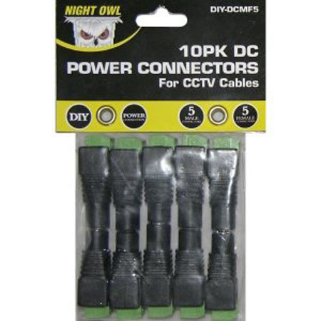 The Night Owl DIY-DCMF5 is a 10PK of DIY CCTV power connectors (DC) for CCTV cables. These connectors easily attach to CCTV coaxial cables to transfer power from your camera to your DVR. This package comes with 5 male and 5 female connectors. Recommend using Night Owl's CAB-RG59W-1000VP or CAB-RG59W-500VP. These connectors are compatible with all Night Owl DVRs and cameras.