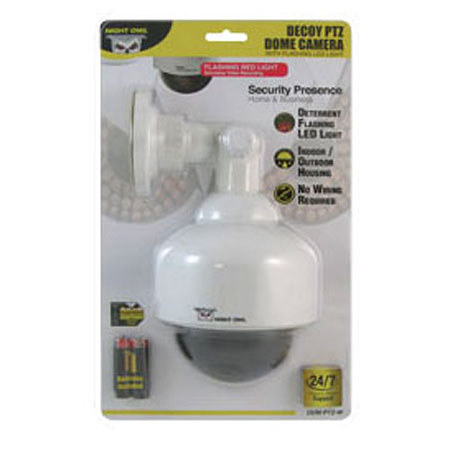 The Night Owl DUM-PTZ-W PTZ Decoy Camera with Flashing LED Deterrent Light (White) has a flashing red LED light that gives the decoy camera a realistic look. The stand moves vertically 90deg. to provide you with several mounting options on any ceiling or wall. This decoy camera can be added to your home/business to increase the level of security presence. It also includes a warning sticker as an added security measure.