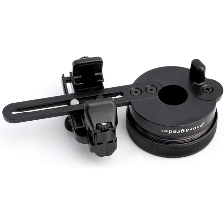 Accepts phone and mini-tablets up to 4-3/8" wide (110mm). Anodized aluminum construction and soft touch grippers that can be adjusted in any direction to ensure they do not interfere with buttons. Accepts eyepieces from 39mm to 60.75mm in diameter.