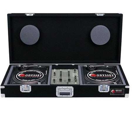 The Odyssey CBM10 Pro Carpeted Battle Mode Case is made to carry and protect two 1200 style turntables in battle mode (sideways 90½) and most 10" mixers. Battle mode is the perfect alignment for scratch DJs. The case is made of heavy-duty felt carpet glued over plywood and is fully foam lined. The carpet covering looks great and provides a durable surface for years of service and protection. The case includes a hinged lid and heavy-duty steel corners. It has recessed butterfly latches and a recessed handle.