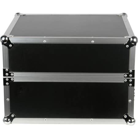 The Odyssey FR1002 Flight Road Combo Rack Case (Black) is made of ABS plastic laminate over 1/4" plywood, designed to protect and transport a mixer and other rackmount equipment. The case has a 10 space angled top mixer rack and two space vertical below to hold other gear. It has a 17.5" interior depth, detachable lid and detachable front cover. The case has steel hardware, chrome-plated butterfly latches and recessed, spring-loaded handles. The case also has small steel corners, aluminum edging and rubber feet.