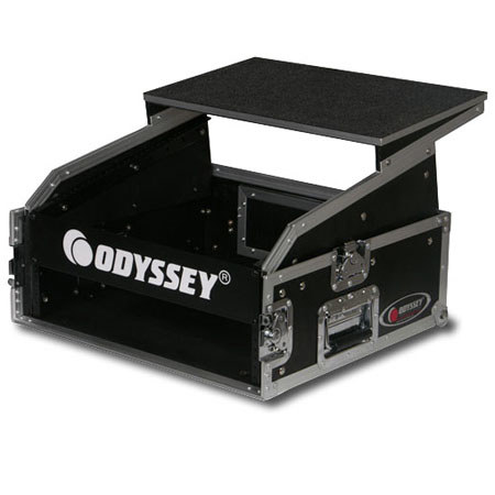 The Odyssey Flight Ready Glide Style Combo Rack Case (10UX2U Space) is an ABS laminated over 1/4" plywood case with a carpeted lining. The case has a glide style laptop shelf that moves front to back for computer use. It holds 10 space slanted rack equipment on top and 2 space vertical rack gear below. There is a removable trap door and front rack rails. The case has chrome-plated recessed butterfly latches and recessed spring-action handles.