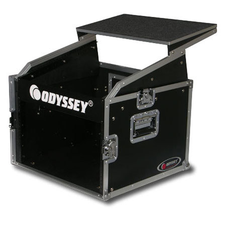 The Odyssey Flight Ready Glide Style Combo Rack Case (10UX6U Space) is an ABS laminated over 1/4" plywood case with a carpeted lining. The case has a glide style laptop shelf that moves front to back for computer use. It holds 10 space slanted rack equipment on top and 6 space vertical rack gear below. There is a removable trap door and front rack rails. The case has chrome-plated recessed butterfly latches and recessed spring-action handles.