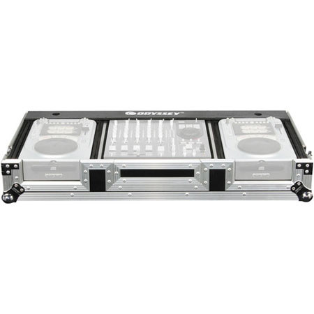 The Odyssey Flight Zone DJ Coffin Case for 2 Medium Format CD Players & 12" Mixer is a black ATA rolling console made of ABS plastic laminate over 3/8" plywood, designed to ship, carry and protect DJ equipment. Three gear wells will hold two CD players and one 12" mixer. The case has steel hardware and chrome-plated butterfly latches. It also has steel corners, aluminum edging and rubber feet. Transported by recessed, spring-loaded handles and two built-in polyurethane wheels. It has front access panels and cabling is clean and easy through convenient access ports throughout. Meets ATA 300 specifications for shipping cases.
