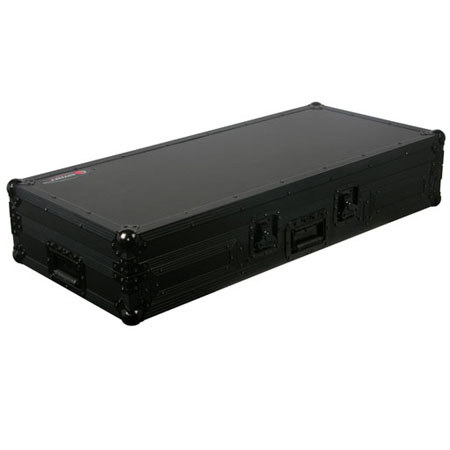 The Odyssey Black Label DJ CD Coffin Case for 2 Large Format CD Players & 12" Mixer is a black ATA rolling console made with ABS plastic laminated plywood, designed to ship, carry and protect DJ equipment. Three gear wells hold two CD players and one 12" mixer. The case has steel hardware and chrome-plated butterfly latches. It also has steel corners, aluminum edging and rubber feet. Transported by recessed, spring-loaded handles and two built-in polyurethane wheels. It has front access panels and cabling is clean and easy through convenient access ports throughout. Meets ATA 300 specifications for shipping cases.