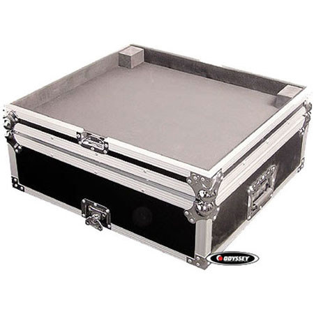 The Odyssey Flight Zone Live Sound Mixer Case is a black case made of ABS plastic laminate over 3/8" plywood, designed to ship, carry and protect a Peavey 24FX channel mixer. The case has steel hardware, chrome-plated butterfly latches and recessed, spring-loaded handles. The case also has steel corners, aluminum edging and rubber feet. It meets ATA 300 specifications for shipping cases.