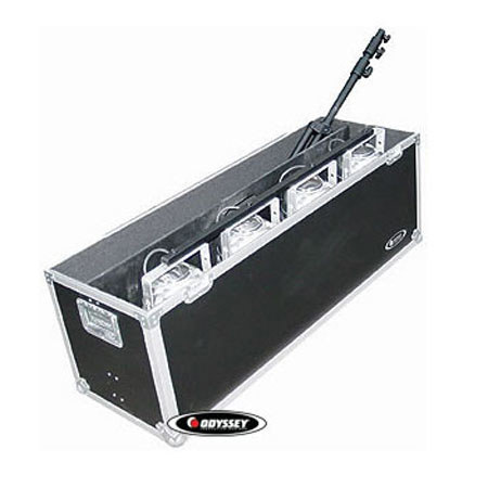 The Odyssey Flight Zone Light-Duty ATA Utility Case is a black case made of ABS plastic laminate over 3/8" plywood, designed to ship, carry and protect up to four Par Can 56 lights with a tripod stand and accessories. The case has steel hardware, chrome-plated butterfly latches and recessed, spring-loaded handles. It also has steel corners, aluminum edging and rubber feet. The case meets ATA 300 specifications for shipping cases.