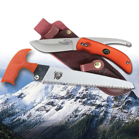 The Outdoor Edge SwingBlaze-Pak Includes 3.6" Orange Skinning Blade and 6" orange Kodi-Saw. Simply push the lock button and the blade changes from a drop-point skinner to the most effective gutting blade for big game. This innovative design cuts beneath the skin to open game like a zipper and eliminates cutting hair or internal organs. The SwingBlaze is hand finished shaving sharp from AUS-8 stainless steel and subzero quenched for superior edge retention and performance. The T-handle wood/bone saw with 6" diamond-cut blade is ideal for quartering game or clearing thick brush. Rubberized Kraton handles ensure a positive, non-slip grip, even when wet. The SwingBlaze-Pak comes complete with a quality leather belt sheath.