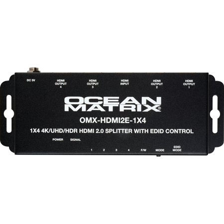The Ocean Matrix OMX-HDMI2E-1X4 supports resolutions up to 4K/UHD (4096 x 2160) but also works with HD & SD signals without loss while maintaining the highest standards. The unit also meets all standards for HDMI 2.0 and HDCP 2.2 specifications. To simplify installations in larger applications such as digital signage, sports venues or houses of worship, the OMX-HDMI2E-1X4 employs EDID management to ensure device compatibility and communication between display and source.