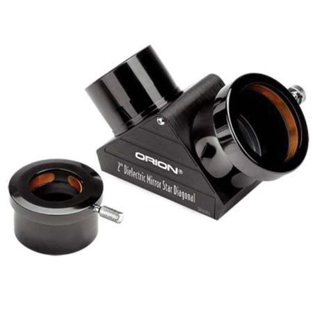 The Orion 2" Dielectric Mirror Star Diagonal features sophisticated, lab-tested dielectric coatings that boast an astounding 99% reflectivity. Dielectric coatings are more durable than enhanced aluminum coatings, so you'll enjoy years of exceptional performance. The machined and anodized aluminum housing features machine-threaded baffles for high contrast and a nonmarring compression ring collar for securing the eyepiece. The 2" model has a 1.25" adapter to accept 1.25" eyepieces. Nosepiece barrel is threaded to accept filters.