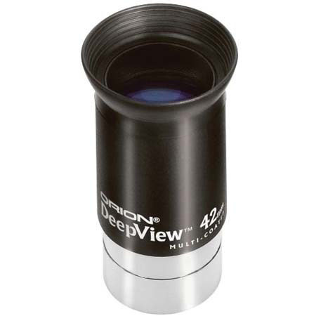 The Orion 42mm DeepView Eyepiece provides the brightest and sharpest images of deep-space objects with low power and a wide field of view. It features anodized aluminum housings and a 3-element lens design with multi-coatings for efficient light transmission. Eye relief is 20mm - a welcome spec for eyeglass wearers - and the rubber eyeguards fold down out of the way if desired.