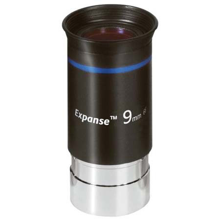 The Orion 9mm Expanse Eyepiece features 66° apparent field of view. It shows objects like the Andromeda Galaxy, the Double Cluster, or the star clouds in Sagittarius in one sweep. Expanse oculars have big eye lenses and great eye relief (13mm to 17mm). Eyeglass wearers can view the entire field without removing their glasses.