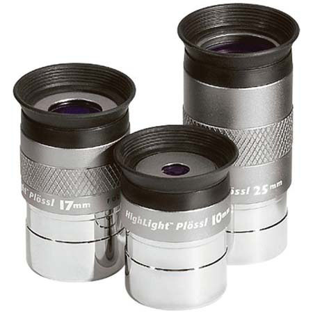 The Orion 10mm, 17mm & 25mm HighLight Plossl Starter Eyepiece Set provides excellent image quality, good eye relief, wide fields of view and affordability. This Highlight Plossl Starter Set represents an ideal upgrade set to replace lower-quality eyepieces, it includes three must-have focal lengths for low, medium and high-power viewing: 25mm, 17mm and 10mm.