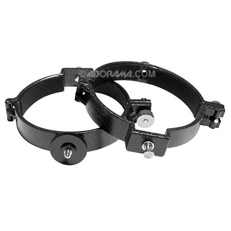 The Orion 116mm ID Telescope Tube Ring set features quick-release hinged clamp knobs and felt lining. Designed for use with Orion mounts, they fit some other brands of mounts as well. One of the two rings in the set has a 1/4"-20 piggyback camera adapter on it, the other has a threaded 1/4"-20 hole.