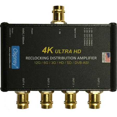 The SDI Distribution Amplifier series includes 12G, 3G, HD, SD, DVB-ASI models providing wide-ranging adaptability for complex workflows. Various models have both reclocking and non-reclocking versions. For ease of use these amplifiers can be powered from any USB2.0 / 3.0 port or with the included Wall Power Supply using the supplied lockable USB power cable.