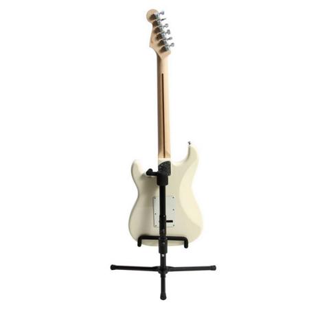 A small stand with big time security! The GS7140 features a unique spring mechanism that locks your guitar in place, effectively making the stand and instrument one unit. The stand and guitar can be moved around stage or studio together with one hand. Operation couldn't be easier; simply press your guitar into the spring-loaded lower yoke and lock it into place under the upper yoke. Designed for the working musician, the GS7140 accommodates most full size electric guitars and bass with cutaway body designs. Patent-pending design.