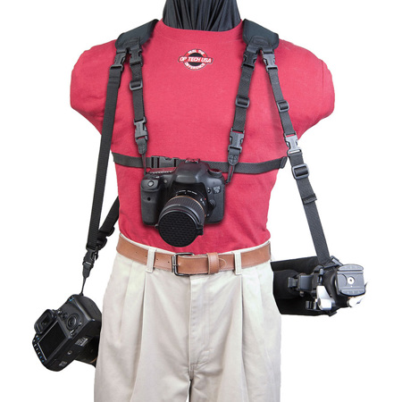 A single camera can be carried sling-style by using the included under-arm cinch strap opposite the camera to secure the yoke of the harness firmly in place. With just a few clicks, a pair of binoculars or a camera can be added to either the center or opposite side. It can even carry a tripod with the addition of a pair of Op/Tech System Connectors - Tripod Loops (sold separately). And since the Triple Carrier utilizes Op/Tech exclusive Uni-Loop System Connectors, it is fully compatible with most other Op/Tech System Connectors, neck straps, wrist straps or harnesses. Give it a try to see how the Triple Carrier. can change along with your ever-changing needs.