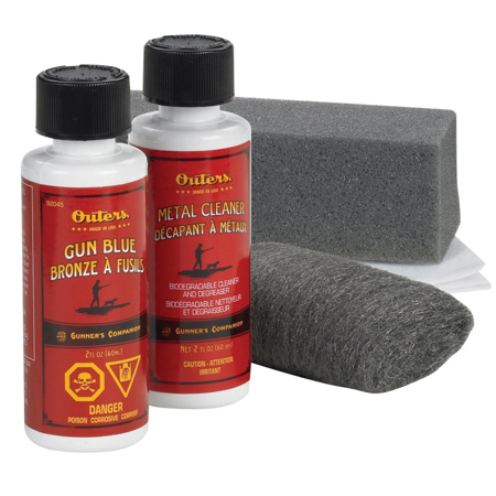 The Outers 3 Piece Gun Blue Kit (Clam) includes all you need to do the job right. It includes Blue and Metal Cleaner (2 oz), steel wool pad, applicator sponge and polishing cloth. The cold blue chemical penetrates deep to leave a handsome, long-lasting, blue-black finish.