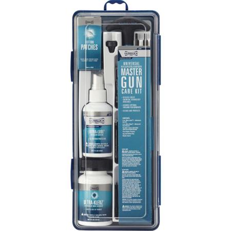 The kit includes a 4oz Ultra-Lube and Ultra-Klenz solution, a cleaning rod with guard, various brushes, mops, patches, tips, and jags. All these come in a durable storage box.