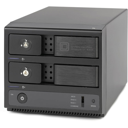 The Mobius 2C RAID is a dual-bay RAID system offering the latest Type-C for compatibility with all USB and Thunderbolt 3, 4 & 5. The Mobius 2C RAID provides hardware RAID options: RAID 0 (Striping), RAID 1 (Mirroring), JBOD (independent drives) and BIG (Non-RAID merged drives).