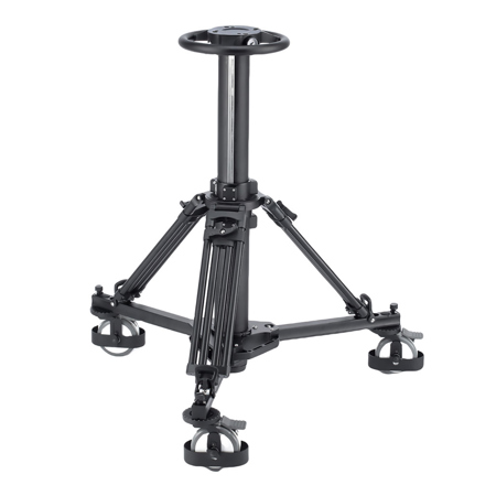 PED50 Light Studio Pedestal with 15" on-air stroke - for use with industry standard flat base, and with an adapter, for use with 150mm, or 100mm fluid heads. Includes DOLLY HD heavy-duty studio dolly with precision asimuth-tracking wheels & cable guards.