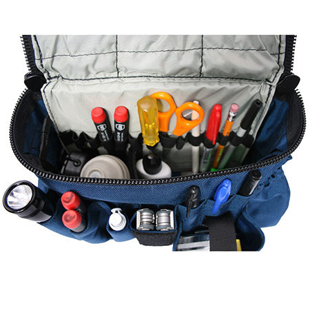 The exterior of the pouch has 3 slip pockets that can hold dry-erase markers, sharpies, pens and pencils. There are also 2 medium sized pockets and 2 large pockets to hold a mini mag light, leatherman, small screw drivers, lens pens or other various tools. Also on the exterior of the case are two elastic pockets for canned air and a closed top tape measure pocket.