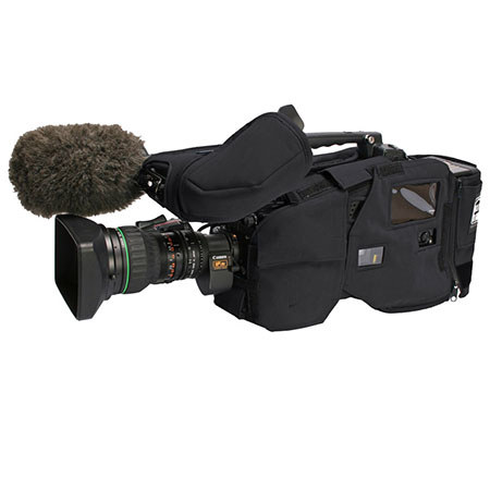 Even though the exterior material is soft to the touch, it's meant to withstand the rigors of ENG or EFP style shooting. This soft, micro suede material is also useful during long periods of shooting since it won't irritate the user's face. The armor also covers the viewfinder offering added protection from the elements. The rear section of the cover contains a zipper that allows the camera owner to use larger brick batteries. If the extension is removed, the owner simply zips a smaller section of the case together.