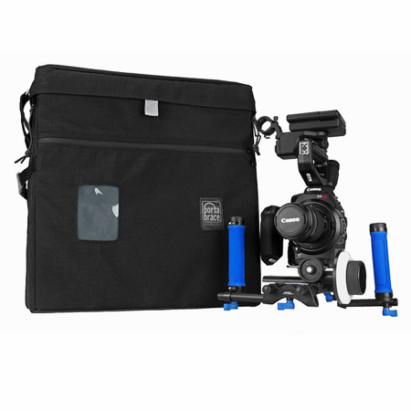 The main compartment is accessed via strong YKK zippers and a secure Velcro strip along the front flap. The compartment is empty and can be configured to meet your needs using Porta Brace's included 7 x 13" divider, Camera Tie-down Cinch and Camera Support Block (foam block). The case also comes with two padded lens cups and a handy white balance card. Two large accessory side pockets are accompanied by a front slip pocket for various accessories. Cameras and Equipment not included.