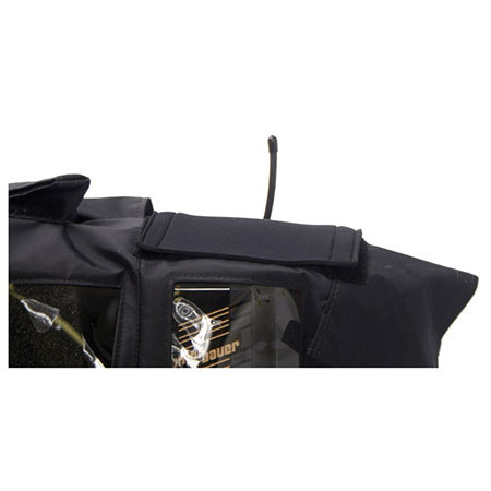 Clear Vinyl windows are used to provide unobstructed visibility of camera controls. Velcro-sealed openings are carefully placed to provide full access to controls and power supply without allowing water to seep in. The adjustable neoprene lens gasket creates a tight seal around the lens and an included detachable visor adds extra protection against droplets reaching the glass.